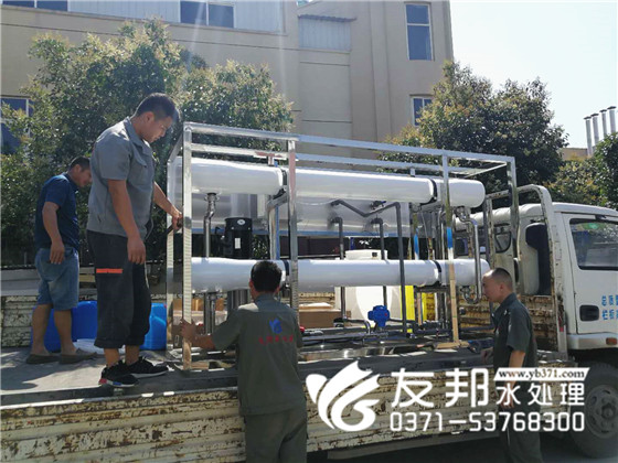 這套型號為YB-CJS-005,每小時出水5噸的單級水處理設備是發往新鄉的,工人們冒著炎炎夏日正在裝車發貨。