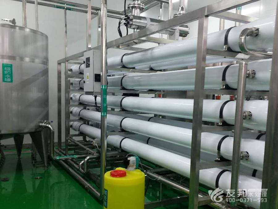 地下水或自來水——原水增壓泵——石英砂過濾器——活性炭過濾器——加藥裝置——精密過濾器——一級高壓泵——一級反滲透——二級高壓泵——二級反滲透——水箱——成品水
